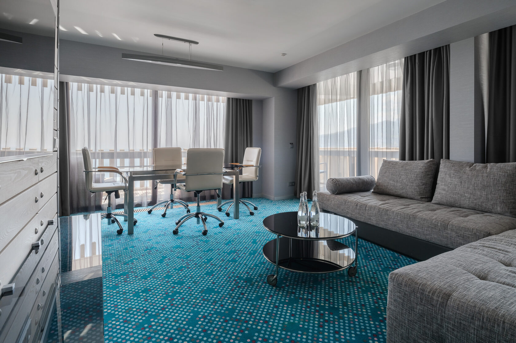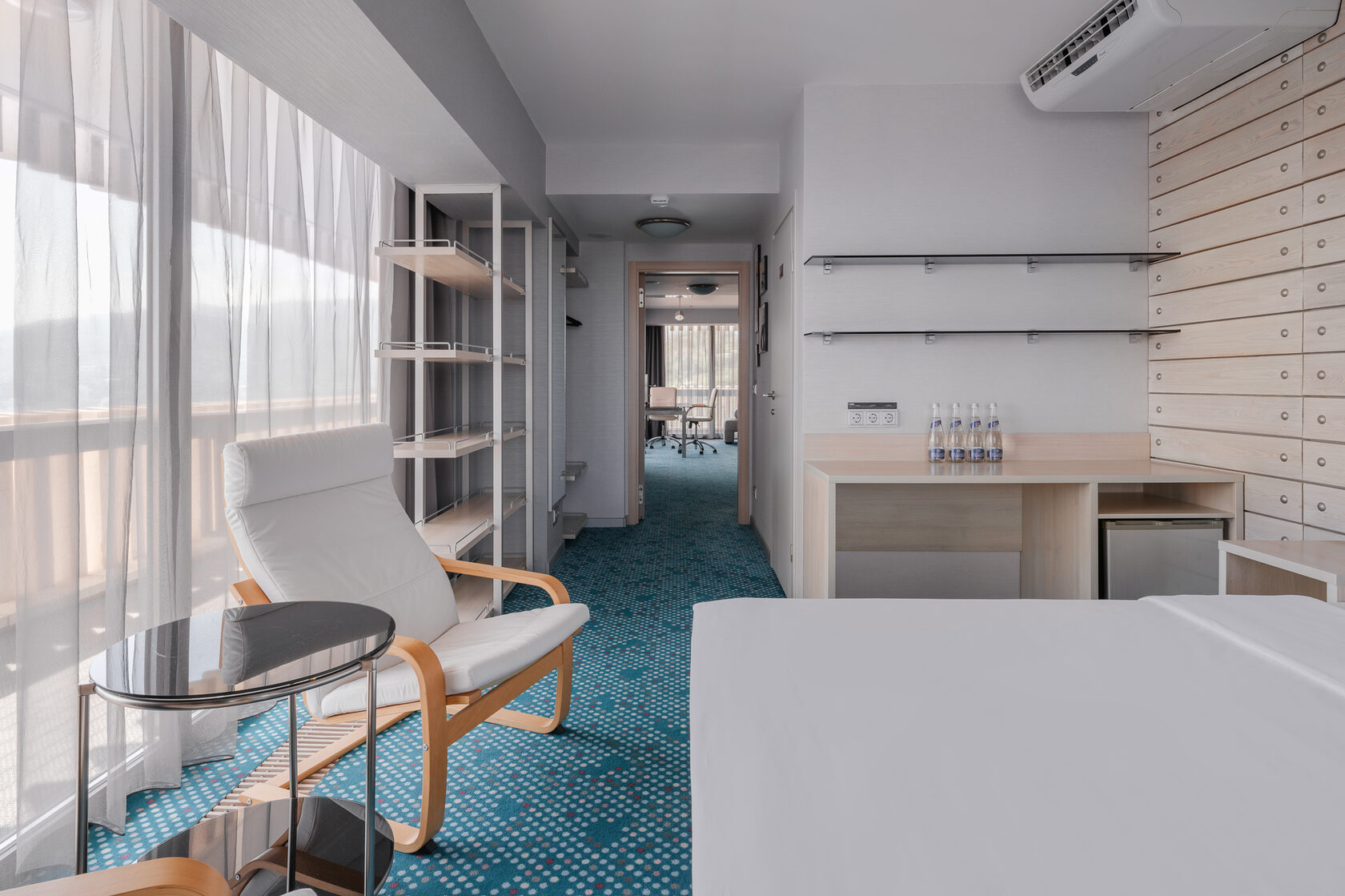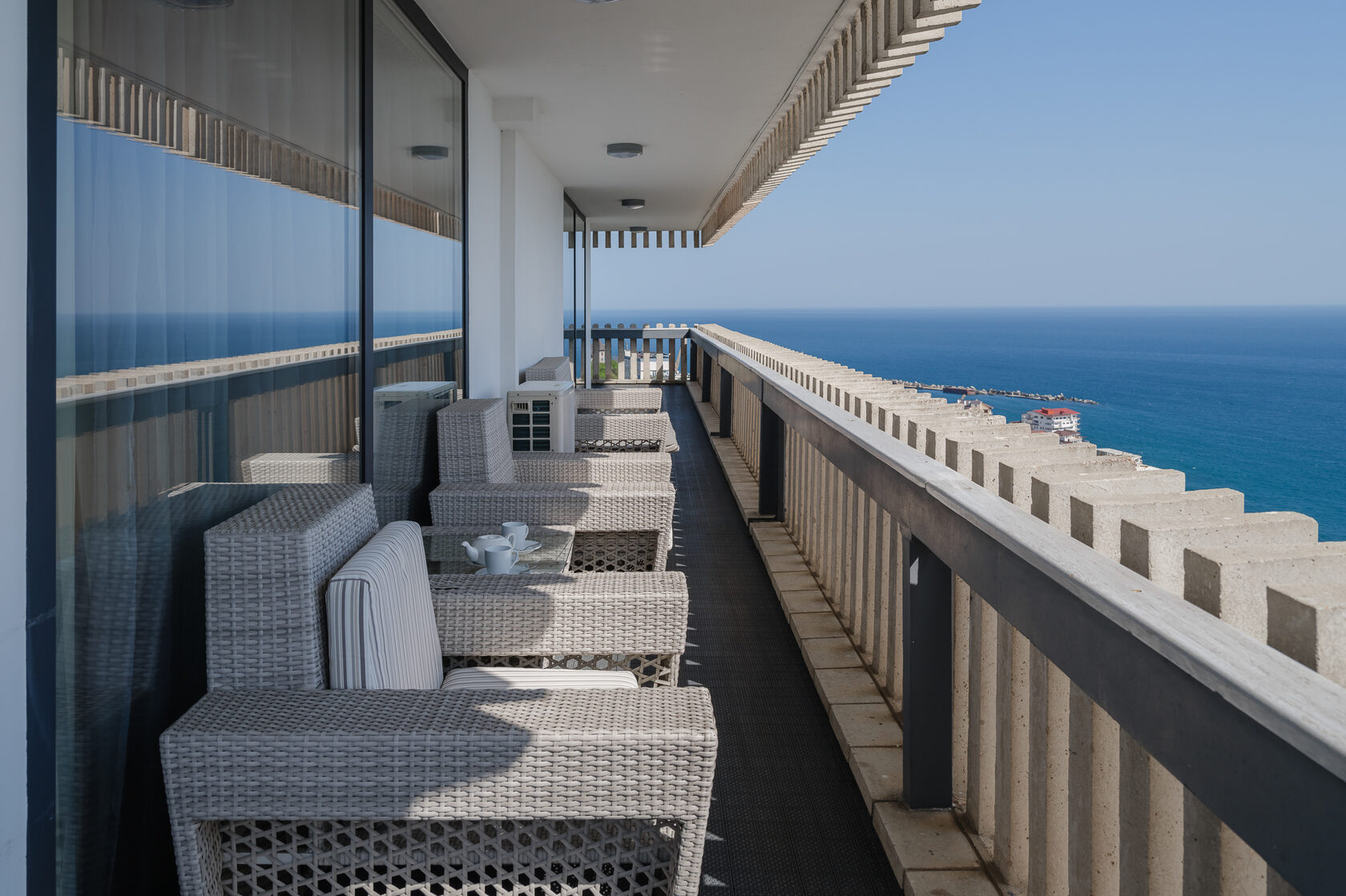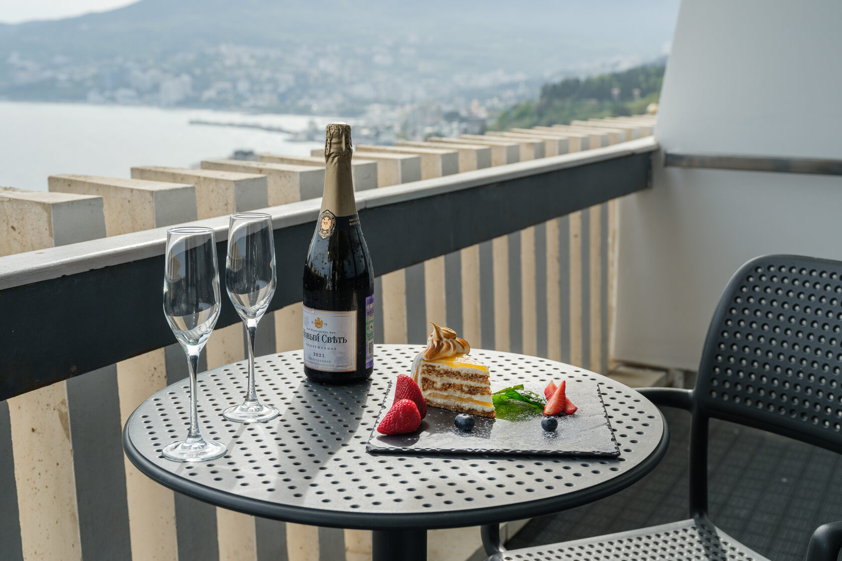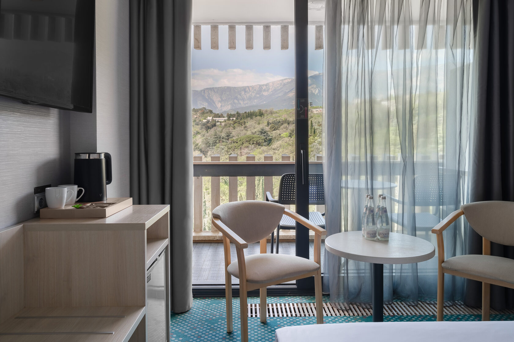 "Президентский" - Премиальный номер с панорамным видом на Черное море и горы. Предусмотрены две комнаты с двуспальными кроватями (King Size), гостиная с мягким диваном, зона отдыха, кухня и балкон с шезлонгами. К вашим услугам мини-бар, кондиционер, Wi-Fi, телевидение, холодильник, сейф, чайная станция, кофемашина, фен, две ванные комнаты с косметическими принадлежностями. Площадь 75 м².