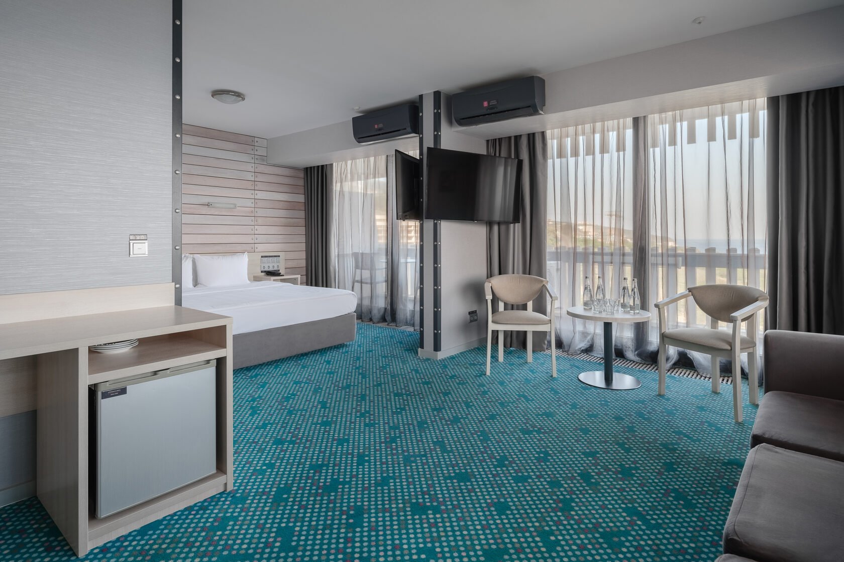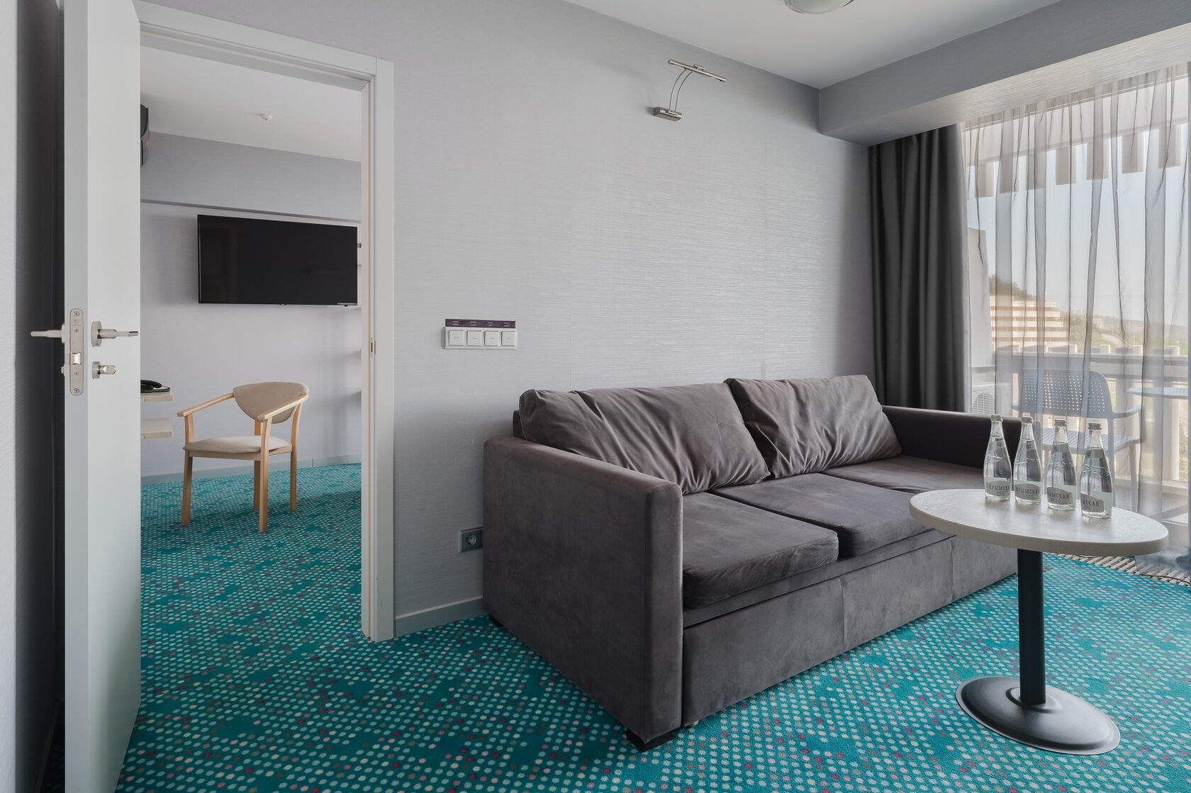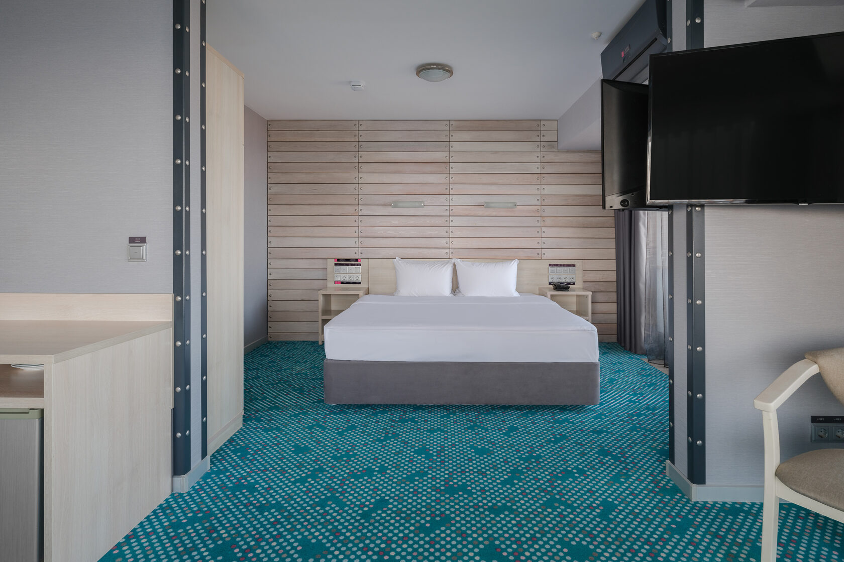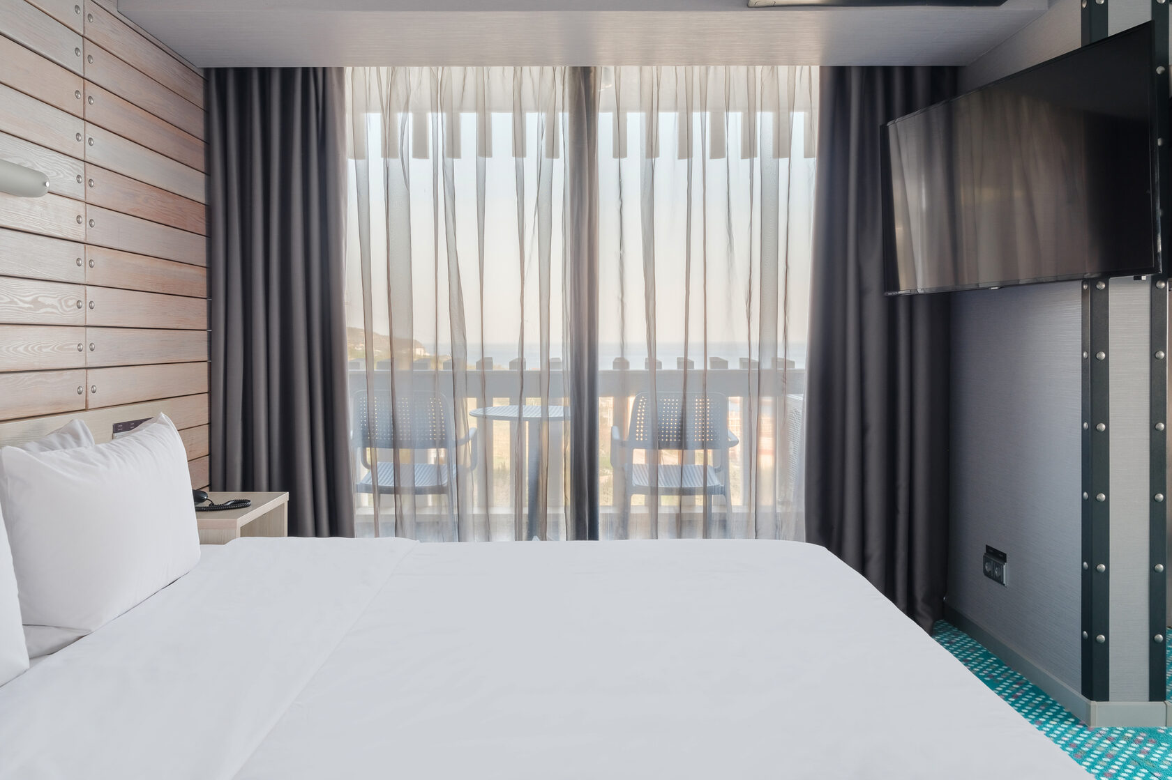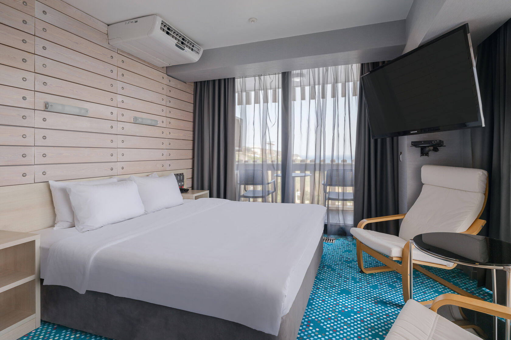 "Президентский" - Премиальный номер с панорамным видом на Черное море и горы. Предусмотрены две комнаты с двуспальными кроватями (King Size), гостиная с мягким диваном, зона отдыха, кухня и балкон с шезлонгами. К вашим услугам мини-бар, кондиционер, Wi-Fi, телевидение, холодильник, сейф, чайная станция, кофемашина, фен, две ванные комнаты с косметическими принадлежностями. Площадь 75 м².