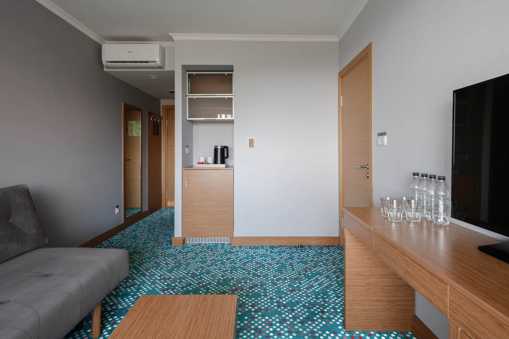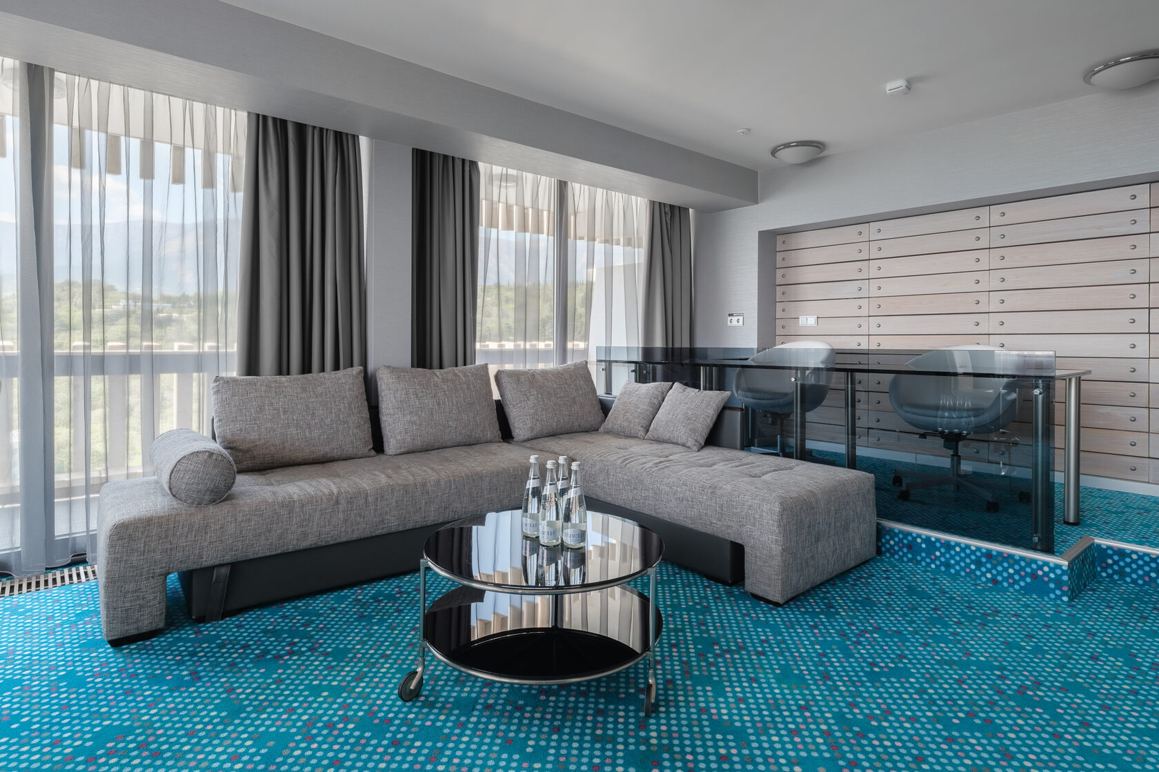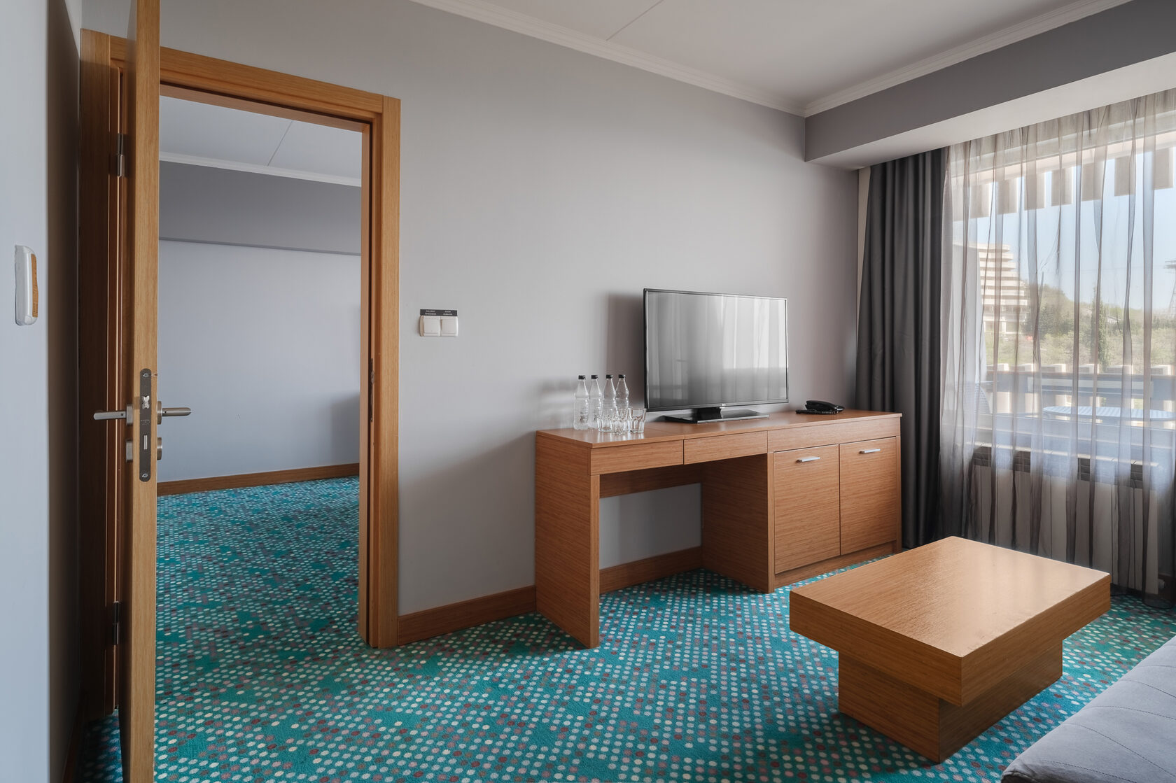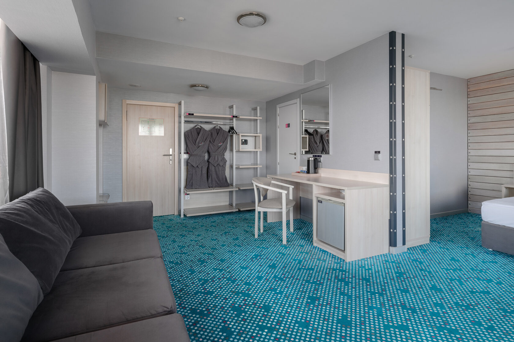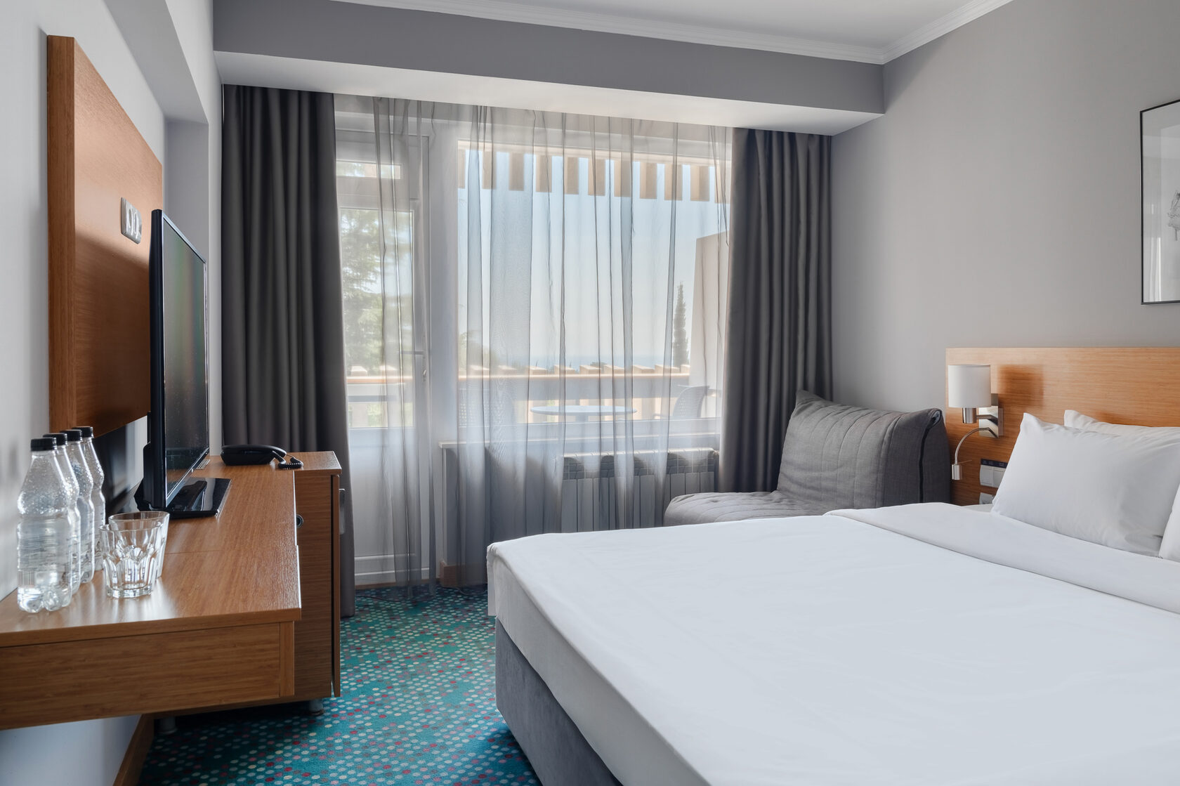 "Президентский" - Премиальный номер с панорамным видом на Черное море и горы. Предусмотрены две комнаты с двуспальными кроватями (King Size), гостиная с мягким диваном, зона отдыха, кухня и балкон с шезлонгами. К вашим услугам мини-бар, кондиционер, Wi-Fi, телевидение, холодильник, сейф, чайная станция, кофемашина, фен, две ванные комнаты с косметическими принадлежностями. Площадь 75 м².