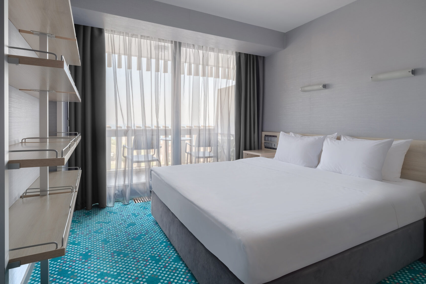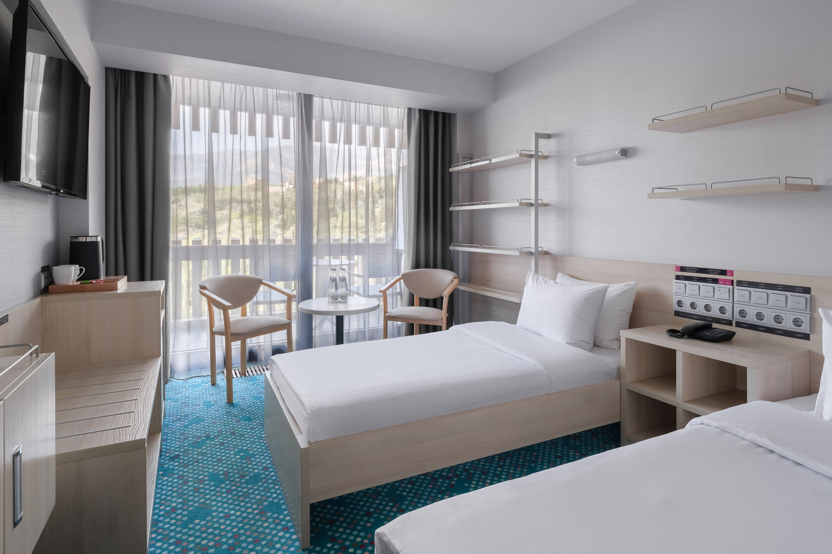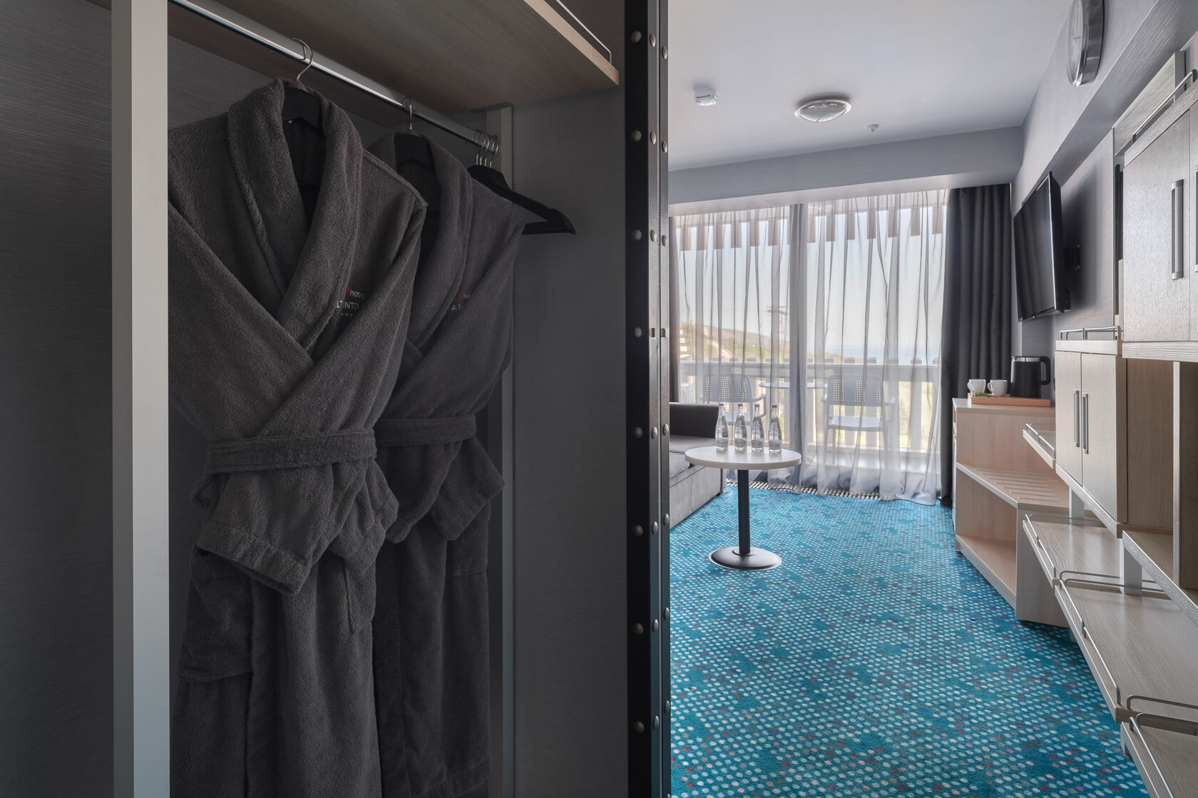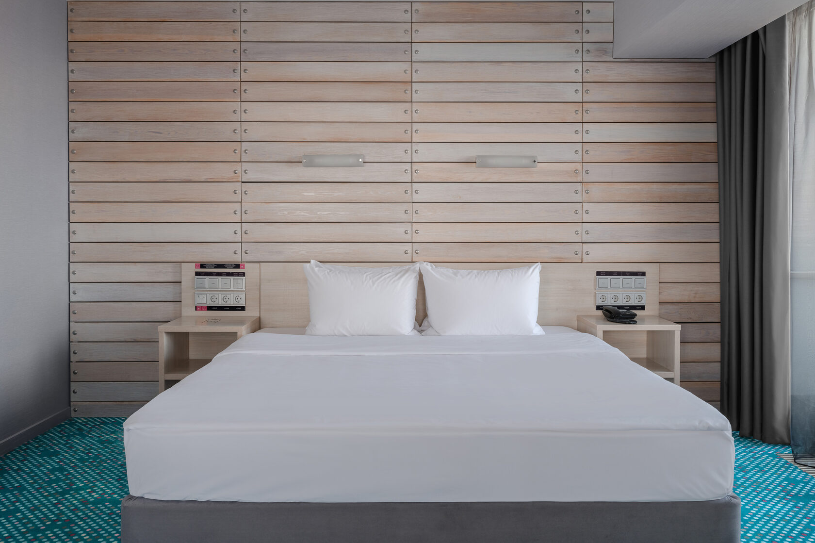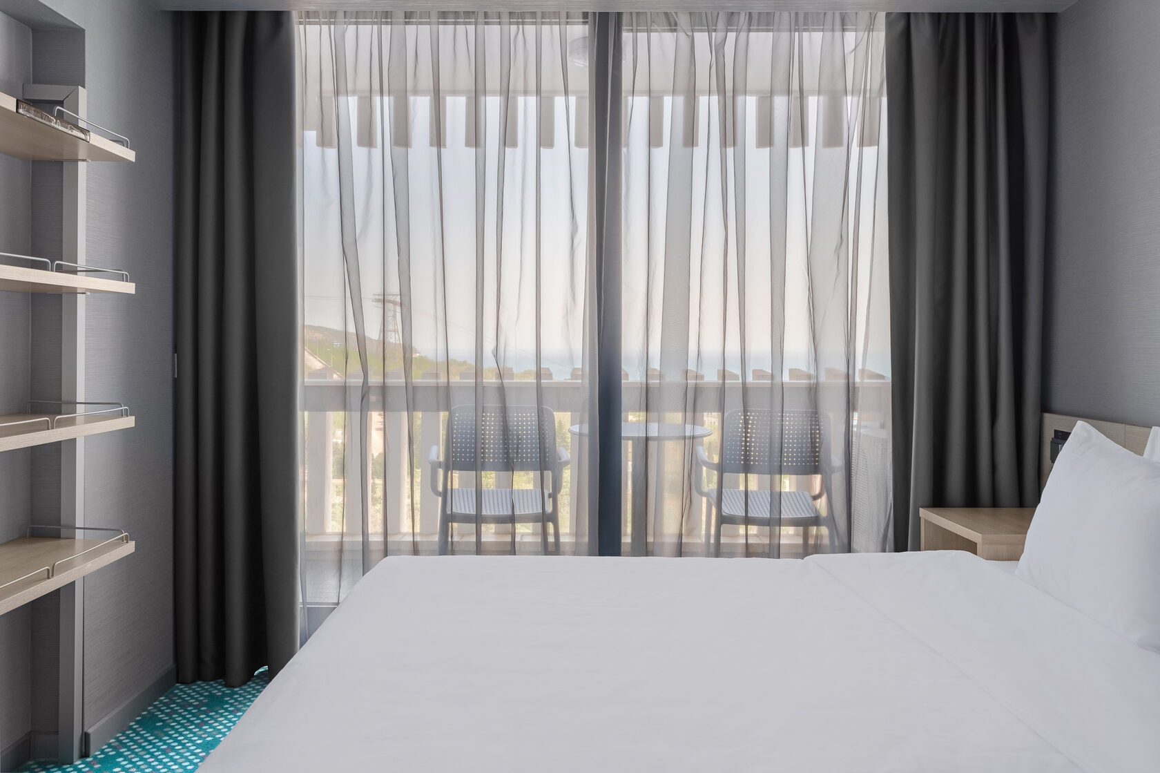 "Президентский" - Премиальный номер с панорамным видом на Черное море и горы. Предусмотрены две комнаты с двуспальными кроватями (King Size), гостиная с мягким диваном, зона отдыха, кухня и балкон с шезлонгами. К вашим услугам мини-бар, кондиционер, Wi-Fi, телевидение, холодильник, сейф, чайная станция, кофемашина, фен, две ванные комнаты с косметическими принадлежностями. Площадь 75 м².